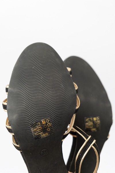 Pre-owned Eram Mixed Material Sandals. Upper leather suede with man made materials. Comfrtoable heel. Gold tone wraping on the suede. Made in Cambodia