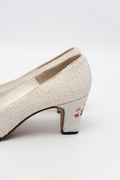 Made in Hong Kong, Exquisite Vintage Full Beaded Heels with a floral motif. Small block heel. Fully beaded design. Absolutely gorgeous and unique. These were custom made for a client (no marked sizing). Made in Hong Kong