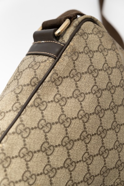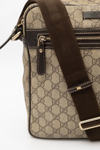 Pre-owned Gucci Unisex GG Supreme Messenger Bag. Monogram GG canvas with dark brown leather trims and canvas adjustable shoulder strap. The most versatile bag. Silver tone engraved Gucci hardware and zips. Made in Italy.