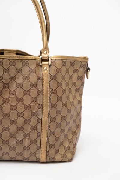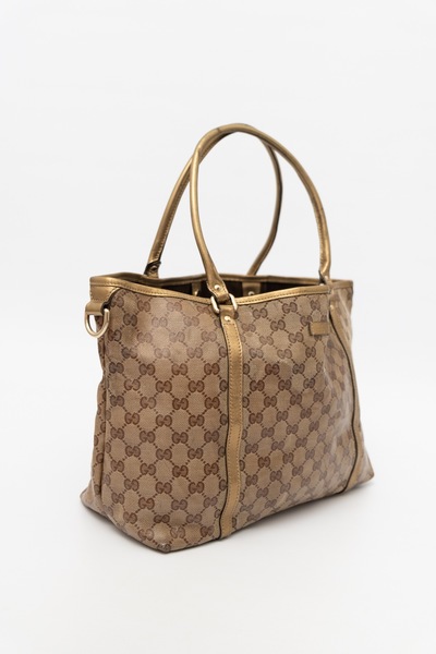 Pre-Owned GUCCI Pre-Owned Crystal Tote Bag Coated Canvas. Monogram printed GG coated canvas. Gold tone leather trims and shoulder straps. Cnavas inner. Small pocket. Gold tone embossed Gucci hardware. Has a snap button closure to close the bag. Made in Italy. Code 197953 002058 . Supplied with MOY dustbag.