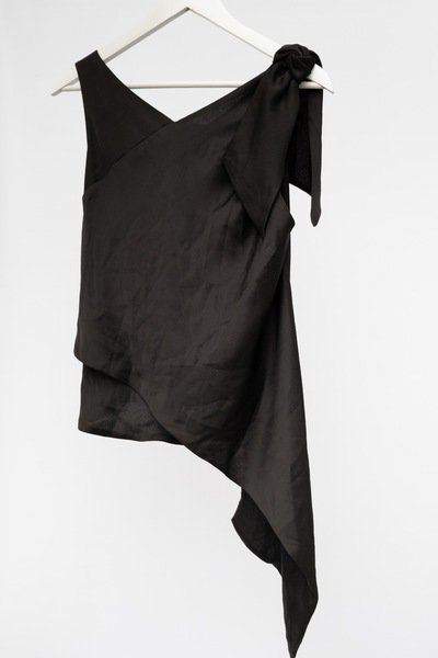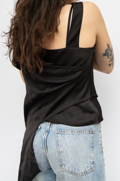 Karen Millen Draped Mixed Fabric Satin Top. Flattering fit with draped bottom and tie shoulders. Side zip. Brand new with tags