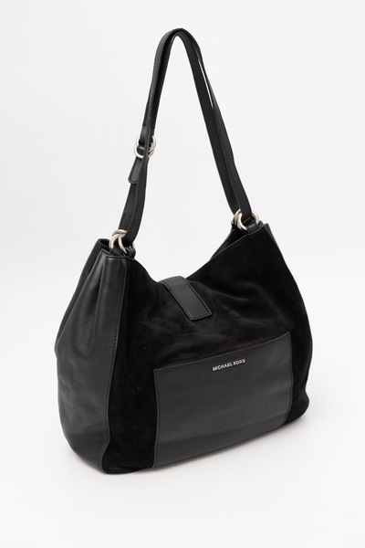Pre-owned Michael Kors Quincy Large Suede Leather Shoulder Bag. Suede outer with leather trims and straps. Shoulder straps can be extended into one long cross body strap. Silver tone embossed Michael Kors hardware. Roomie inside. Logo lining. Multiple pockets. Supplied with MOY dustbag. Retail pre-loved starts at R4400