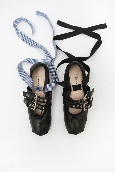 Pre-owne MIU MIU Pre-Owned Buckled Leather Ballerina Shoes. Soft nappa leather. Removable ribbons. Silvertone hardware. Ribbons are removable. Supplied with 2 black ribbons and 1 plaid. Made in Italy. Supplied with MOY dustbag. Retail pre-loved starts at R6600 + tax