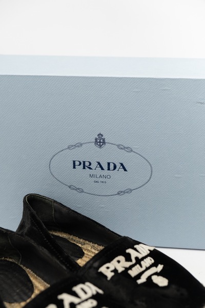 Pre-Owned PRADA Pre-Owned Espadrille Slides Velvet in black. Prada logo on the front. Made in Spain. With the oriignal PRADA Box. These shoes are available with an Outsourced Authenticity Certificate at R300.
