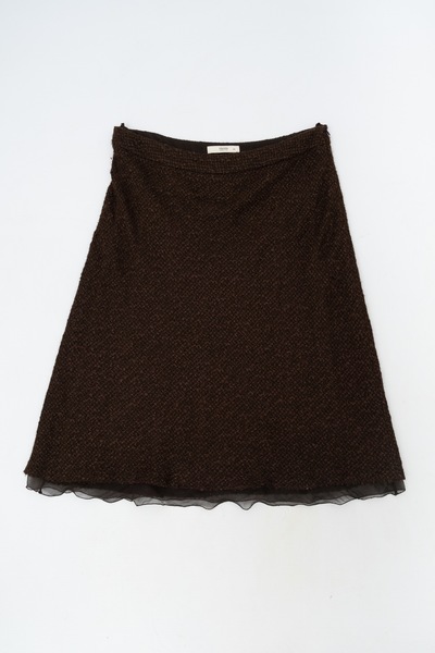 Vinatge PRADA Tweed Midi Skirt With Lace Trim. Circa 1997, similar seen on the runway! Midi length. Chestnut brown tweed with lace trim. Side zip. Made in Italy