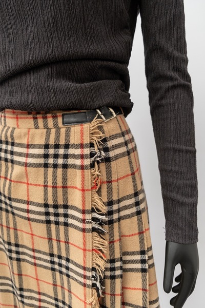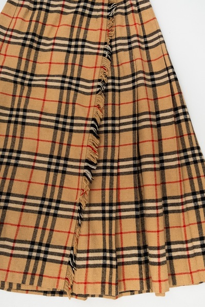 Vintage Checked Pleated Wool Blend Midi Skirt (Very Burberry!) Mid length. Small leather belt detail.