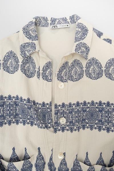 Pre-owned ZARA 100% cotton printed jacket with pockets. Boxy fit with frayed hems. Made in India